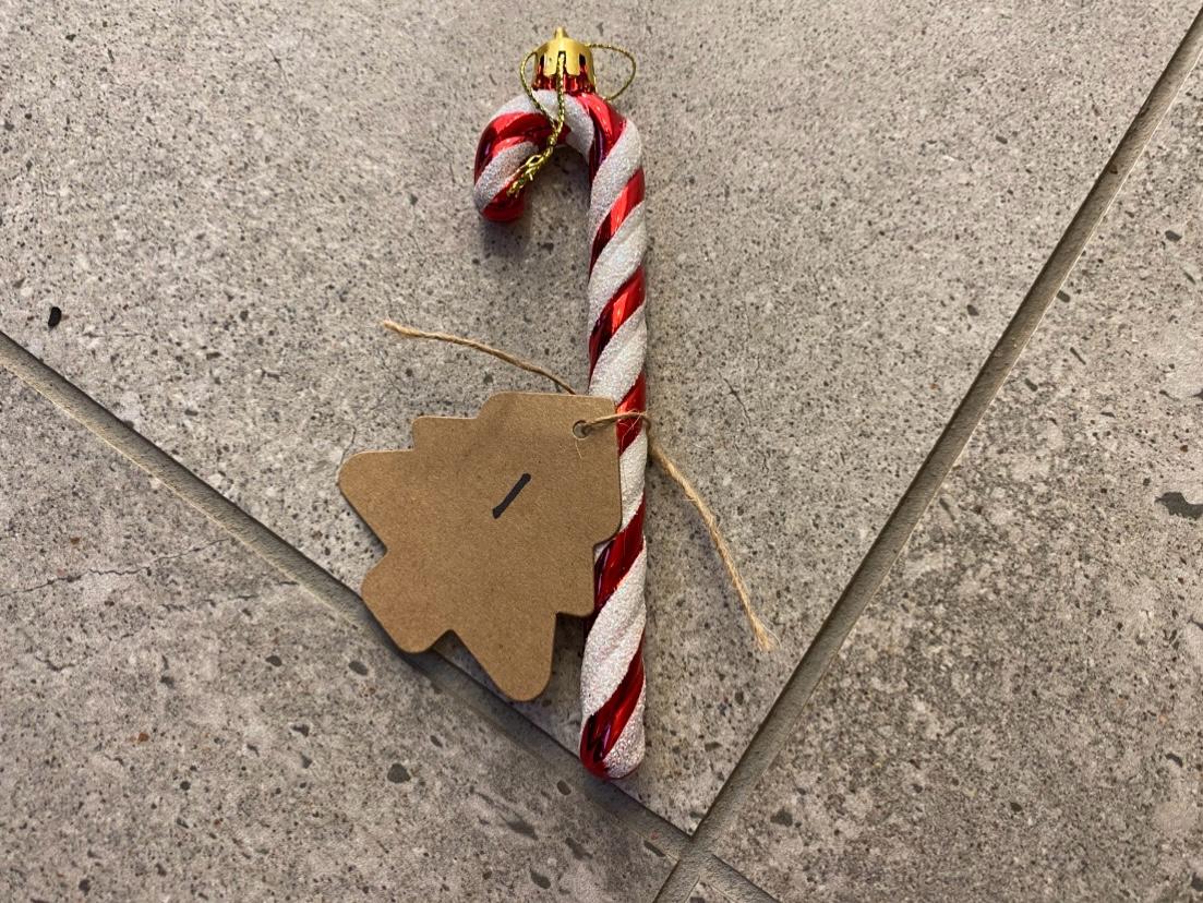 Hang the candy cane on the giving tree in the entrance hall, but keep the label for your info.